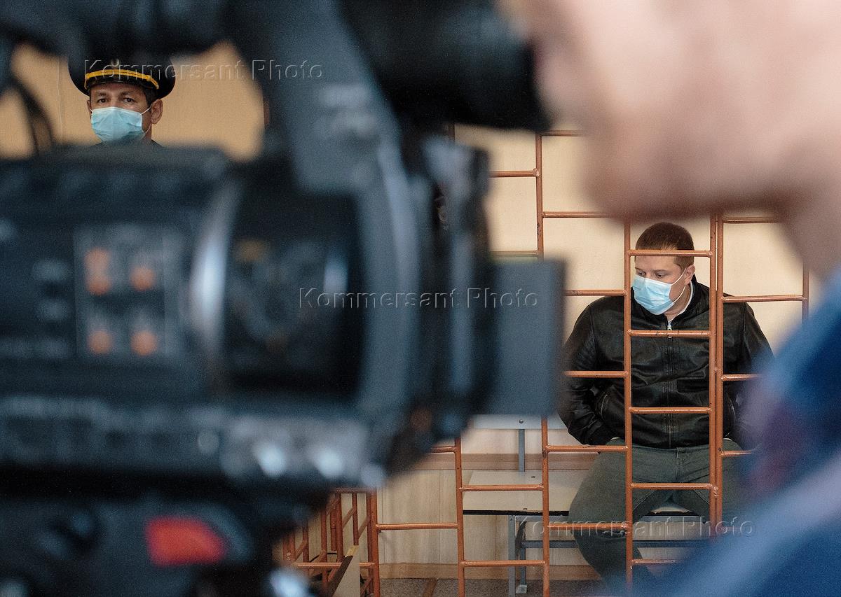 Избрание меры пресечения директору Кудряшовского свинокомплекса (АО "Кудряшовское", входит в холдинг "Сибагро") Владимиру Гавриленко, обвиняемому в экологических преступлениях, в Колыванском районном суде. Директор Кудряшовского свинокомплекса Владимир Гавриленко (справа) во время заседания суда.
