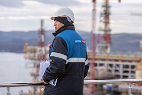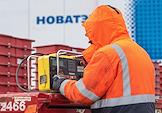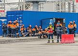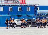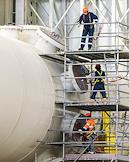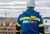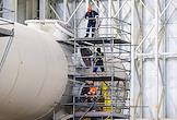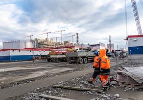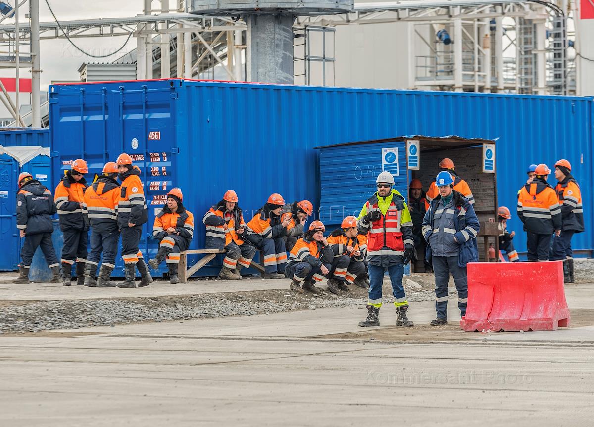 Центр строительства крупнотоннажных морских сооружений (ЦСКМС) компании НОВАТЭК. Производство технологических линий для проекта "Арктик СПГ 2" компании НОВАТЭК. Рабочие на строительной площадке.