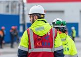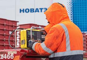 Центр строительства крупнотоннажных морских сооружений (ЦСКМС) компании НОВАТЭК. Производство технологических линий для проекта "Арктик СПГ 2" компании НОВАТЭК. Жанровая фотография. Журналисты во время встречи с генеральным директором компании "НОВАТЭК-Мурманск" Петром Обориным.