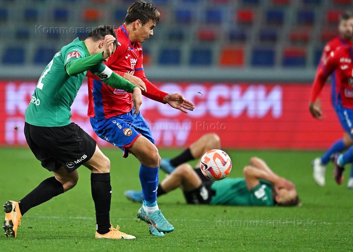 Фонбет - Кубок России по футболу 2022/23. Матч между командами ЦСКА (Москва) – "Торпедо М" (Москва) на стадионе "ВЭБ Арена". Игрок команды "Торпедо М" Хожимат Эркинов (слева) во время матча.