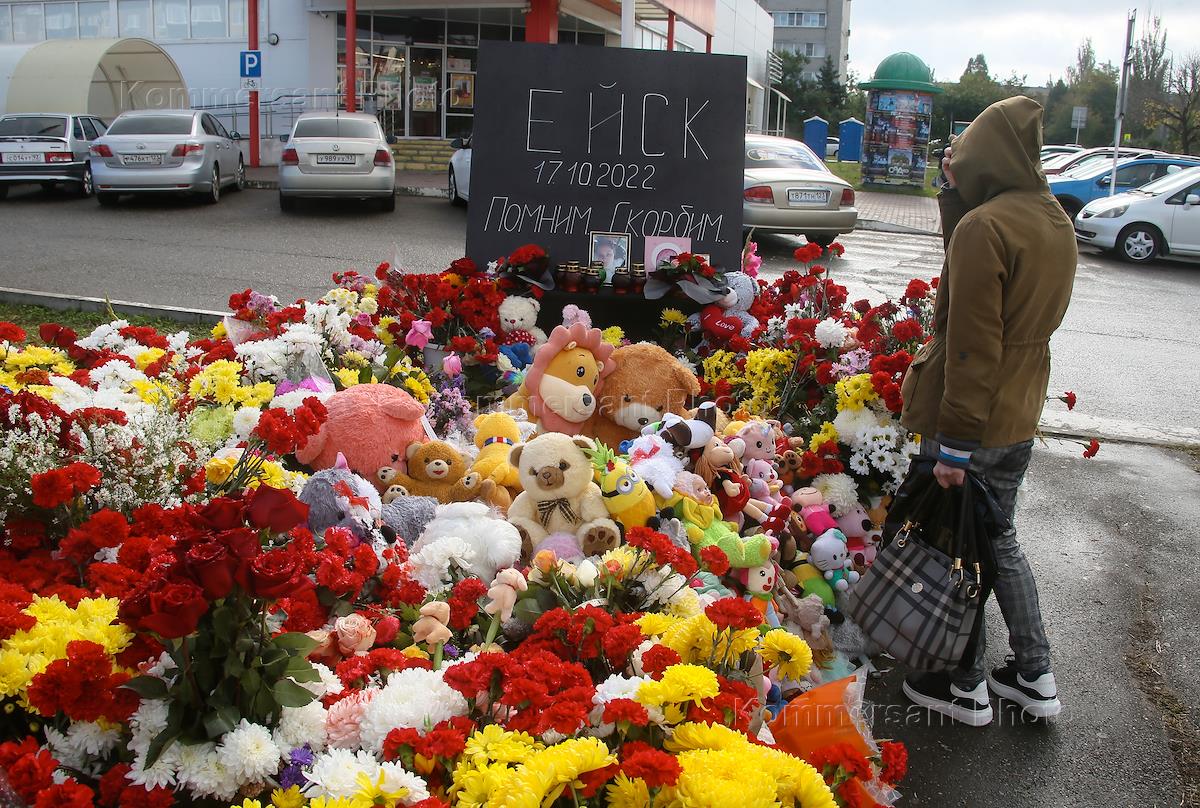 Цветы и детские игрушки в память о погибших жителях жилого дома на Коммунистической улице, в результате авиакатастрофы военного самолета Су-34.