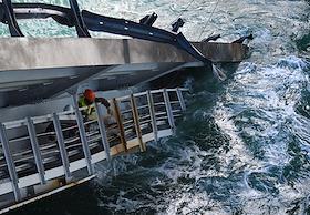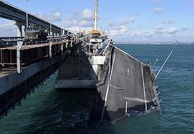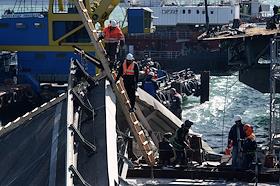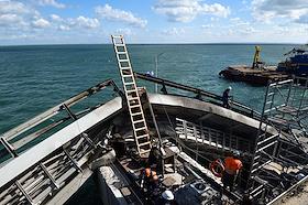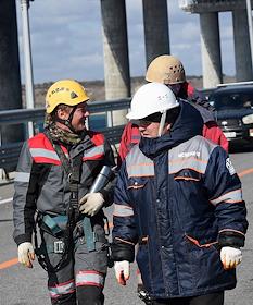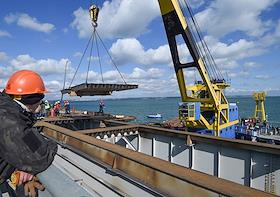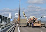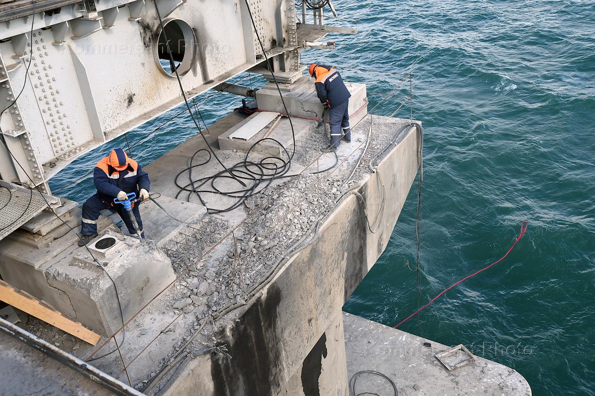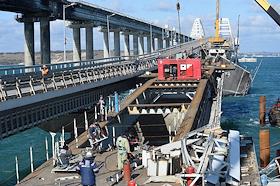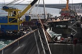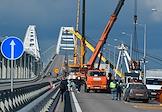 Последствия взрыва на Крымском мосту.Дорожники приступили к демонтажу повреждённых пролетных строений автодорожной части. Работы на мостовом переходе ведутся круглосуточно – сейчас в них задействовано 410 человек и 40 единиц техники.