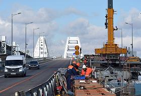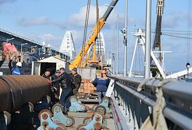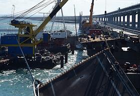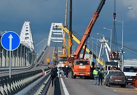 Последствия взрыва на Крымском мосту. Дорожники приступили к демонтажу повреждённых пролетных строений автодорожной части. Работы на мостовом переходе ведутся круглосуточно.