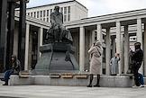 Москва после введения уровня повышенной готовности. Жанровая фотография. Девушки фотографируют памятник писателю Федору Достоевскому у здания Российской государственной библиотеки (РГБ).