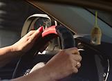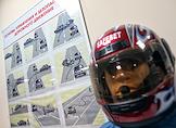 Конкурс профессионального мастерства водителей ГБУ "ХОЗУ при Кабинете Министров Республики Татарстан", посвященный Дню работника автомобильного транспорта. Участница за рулем автомобиля во время прохождения этапа конкурса. Жанровая фотография. Манекен в мотоциклетном шлеме.