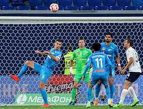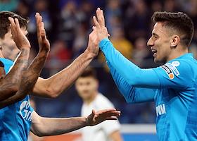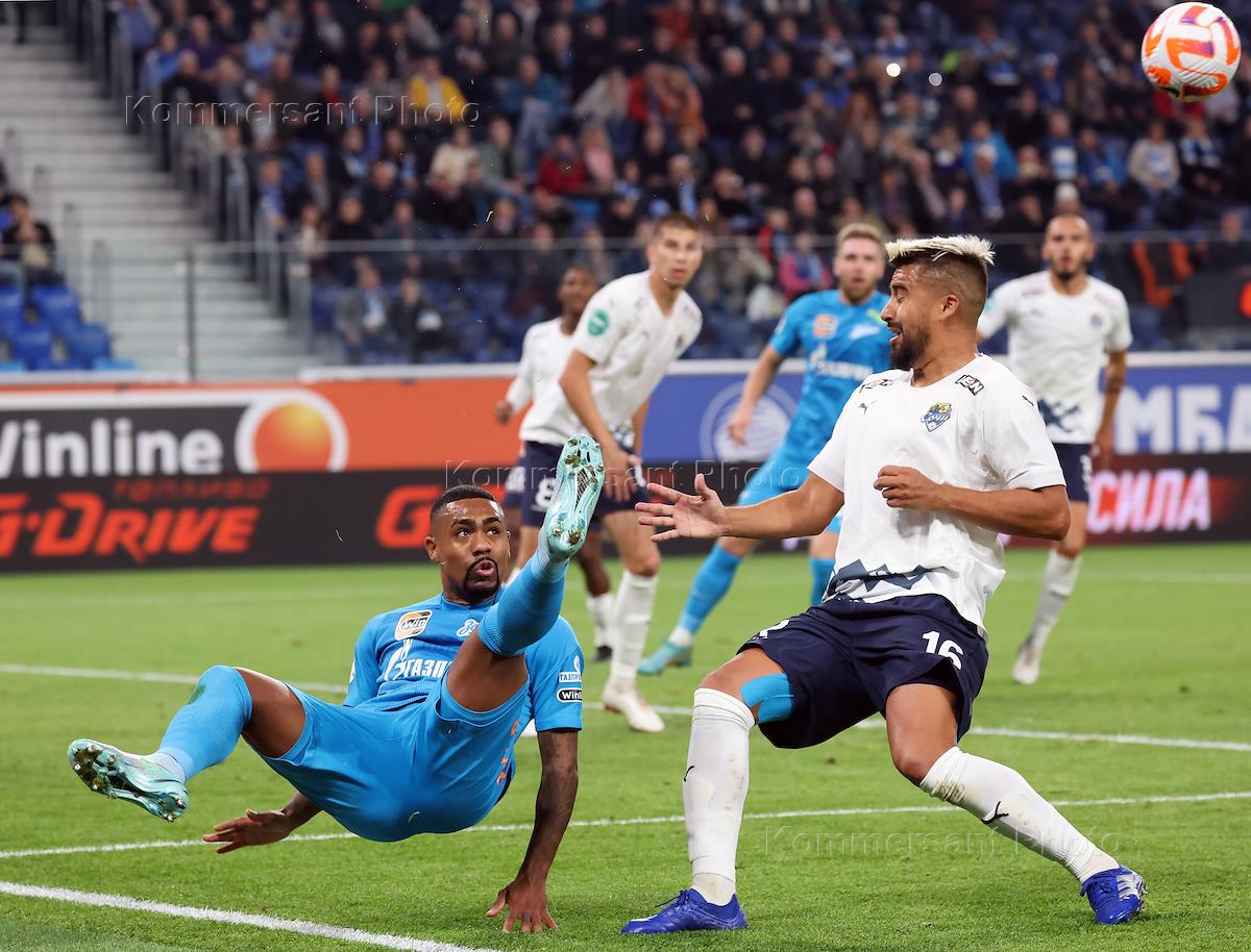 Российская Премьер-Лига (РПЛ). МИР - Чемпионат России по футболу 2022/2023. 14-й тур. Матч между командами "Зенит" (Санкт-Петербург) - "Сочи" (Сочи) на стадионе "Газпром Арена". Игрок команды "Зенит" Малком (слева) во время матча.