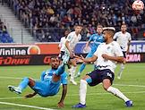 Российская Премьер-Лига (РПЛ). МИР - Чемпионат России по футболу 2022/2023. 14-й тур. Матч между командами "Зенит" (Санкт-Петербург) - "Сочи" (Сочи) на стадионе "Газпром Арена". Слева направо: игрок команды "Сочи" Ванья Дркушич, игрок команды "Зенит" Иван Сергеев и вратарь команды "Сочи" Сослан Джанаев во время матча.