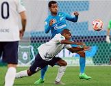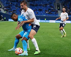 Российская Премьер-Лига (РПЛ). МИР - Чемпионат России по футболу 2022/2023. 14-й тур. Матч между командами "Зенит" (Санкт-Петербург) - "Сочи" (Сочи) на стадионе "Газпром Арена". Игрок команды "Сочи" Кирилл Кравцов (в центре) и игрок команды "Зенит" Дуглас дос Сантос (справа) во время матча.