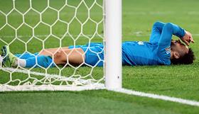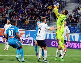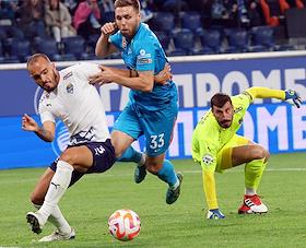 Российская Премьер-Лига (РПЛ). МИР - Чемпионат России по футболу 2022/2023. 14-й тур. Матч между командами "Зенит" (Санкт-Петербург) - "Сочи" (Сочи) на стадионе "Газпром Арена". Вратарь команды "Сочи" Сослан Джанаев (справа) во время матча.