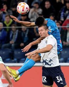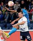 Российская Премьер-Лига (РПЛ). МИР - Чемпионат России по футболу 2022/2023. 14-й тур. Матч между командами "Зенит" (Санкт-Петербург) - "Сочи" (Сочи) на стадионе "Газпром Арена". Игрок команды "Зенит" Клаудиньо (справа) и игрок команды "Сочи" Ванья Дркушич (слева) во время матча.