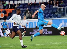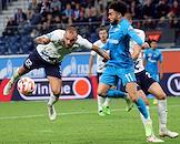 Российская Премьер-Лига (РПЛ). МИР - Чемпионат России по футболу 2022/2023. 14-й тур. Матч между командами "Зенит" (Санкт-Петербург) - "Сочи" (Сочи) на стадионе "Газпром Арена". Игрок команды "Зенит" Малком (справа) во время матча.