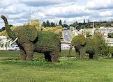 Виды города Губкин. Старый парк. Фигуры слонов из зеленых растений в парке.
