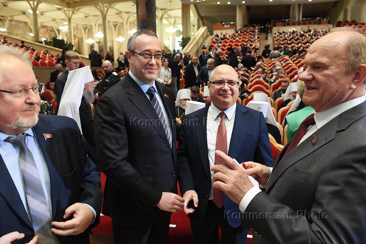 Пленарное заседание XXIV Всемирного Русского Народного Собора на тему "Православие и мир в XXI веке" в Зале церковных соборов храма Христа Спасителя. Лидер КПРФ, член комитета ГД по делам Содружества Независимых Государств, евразийской интеграции и связям с соотечественниками Геннадий Зюганов (второй слева) и глава Донецкой народной республики Денис Пушилин (в центре) перед началом заседания.