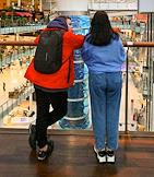 Девушка на эскалаторе рядом с самым большим цилиндрическим аквариумом мира в торговом центре Авиапарк.