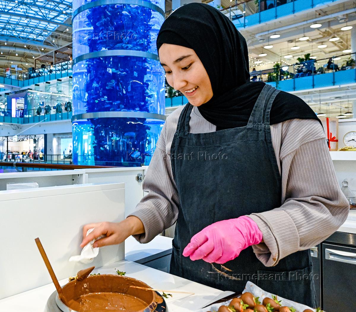 Работа торгового центра (ТЦ) "Авиапарк". Жанровая фотография. Девушка торгует клубникой в шоколаде в торговом центре, где расположен самый большой цилиндрический аквариум в мире.