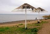 Жанровая фотография. Стационарные пляжные зонтики на берегу реки Вуокса в поселке Лосево.
