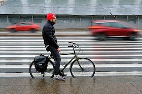 Жанровая фотография. Мужчина на велосипеде стоит в ожидании зеленого сигнала светофора.