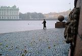 Жанровая фотография. Мужчина собирает монеты в реке Неве при помощи магнита во время тумана.