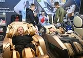 Международная архитектурно-строительная и интерьерная выставка "Красивые дома. Российский архитектурный салон" в МВЦ "Крокус Экспо". Жанровая фотография. Посетители выставки в массажных креслах.