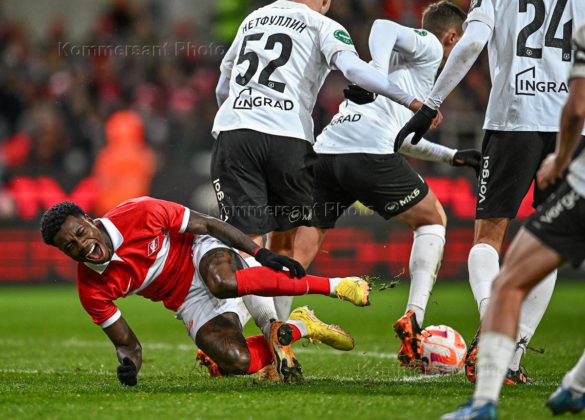 Российская Премьер-Лига (РПЛ). МИР - Чемпионат России по футболу 2022/2023. 15-й тур. Матч между командами "Спартак" (Москва) - "Торпедо" (Москва) на стадионе "Открытие Арена". Игрок команды "Спартак" Квинси Промес (слева) во время матча.