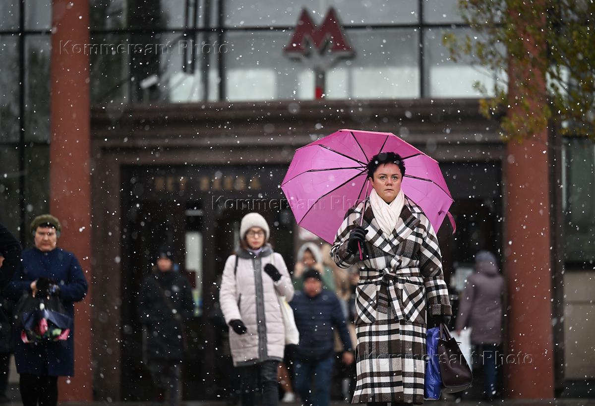 Жанровая фотография. Снегопад в Москве. Люди у станции метрополитена "Чистые пруды" с зонтом во время снегопада.