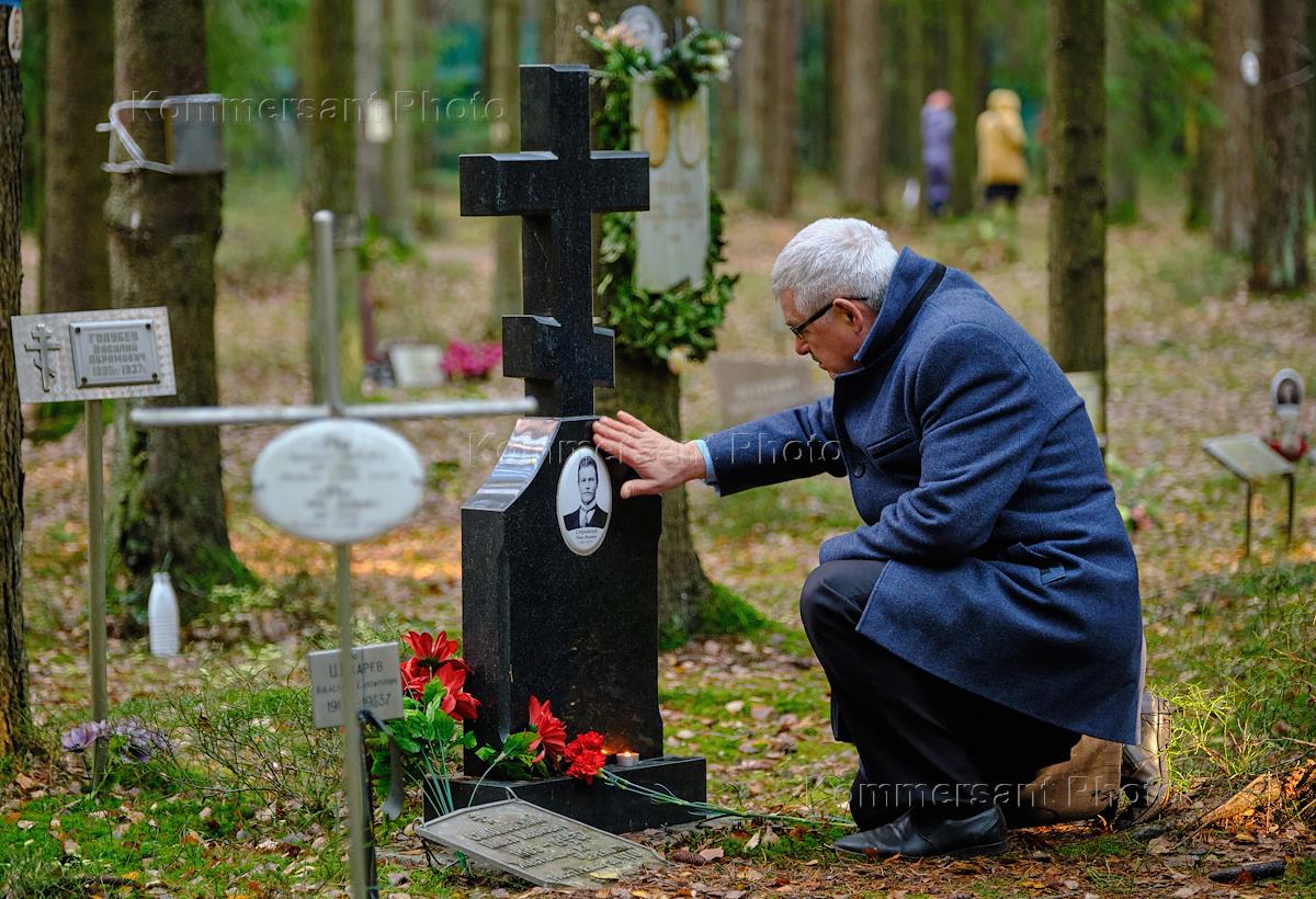 День памяти жертв политических репрессий на Левашовском мемориальном кладбище (Левашовская пустошь). Мужчина у могилы репрессированного на кладбище.