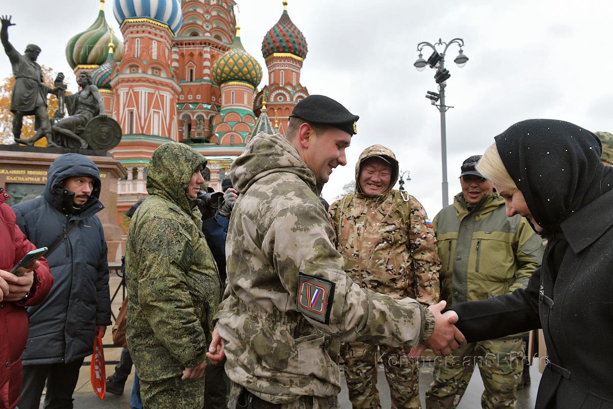 Церемония открытия после реставрации памятника Кузьме Минину и князю Дмитрию Пожарскому на Красной площади. Жанровая фотография. Военнослужащие фотографируются у памятника.