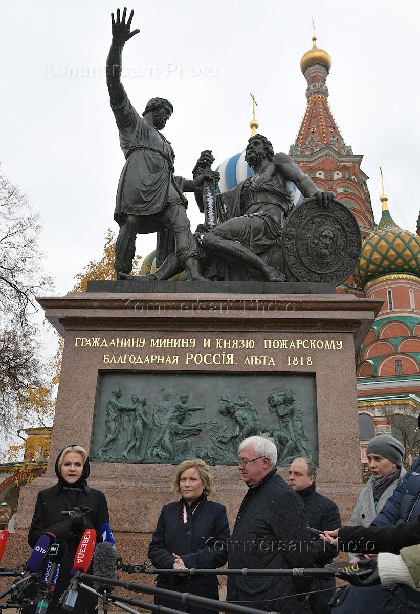 Церемония открытия после реставрации памятника Кузьме Минину и князю Дмитрию Пожарскому на Красной площади. Жанровая фотография. Министр культуры России Ольга Любимова (в центре) и военнослужащие у памятника.