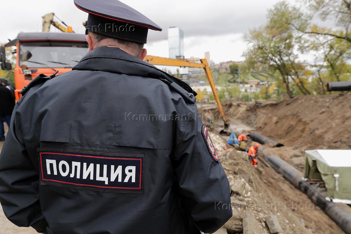 The consequences of a sewer break on the slope of the floodplain of the Tsaritsa River. Genre photography. Police officer at the scene of the accident.