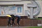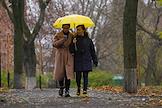 Виды Коломны. Жанровая фотография. Женщины идут под зонтом в сквере в дождливую погоду.