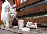 Жанровая фотография. Кошка на лавочке рядом с бумажными стаканчиками.