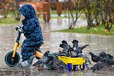Виды Коломны. Жанровая фотография. Ребенок на велосипеде кормит голубей.