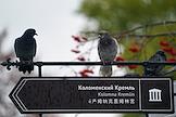 Виды Коломны. Жанровая фотография. Голуби сидят на указателе "Коломенский Кремль".