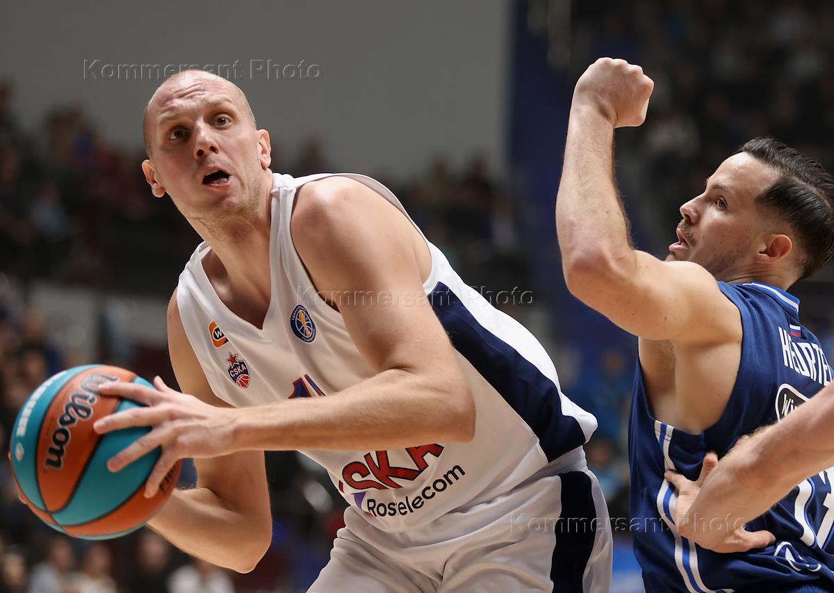 Единая лига ВТБ по баскетболу. Матч между командами "Зенит" (Санкт-Петербург) - ЦСКА (Москва) на стадионе "Сибур Арена". Игрок команды ЦСКА Никола Милутинов (в центре) во время матча.