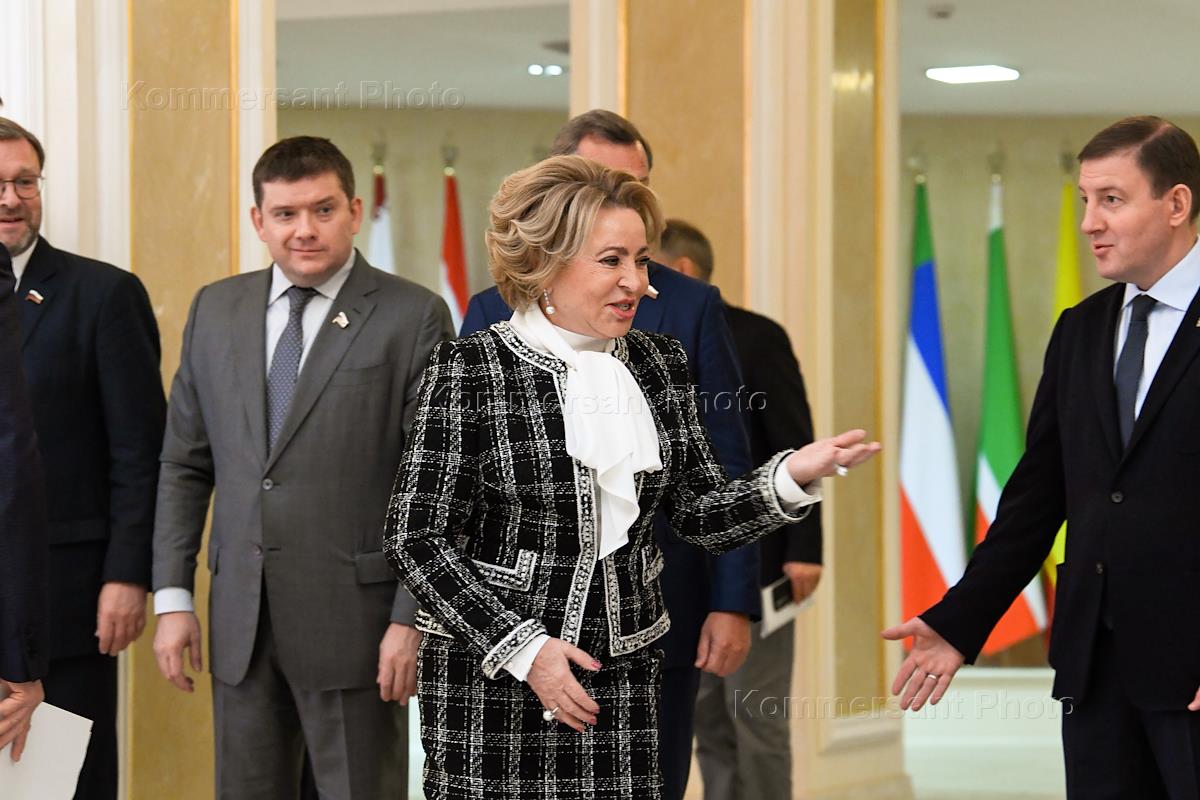 Церемония установки флагов Донецкой и Луганской Народных Республик, Запорожской и Херсонской областей на Аллее флагов субъектов Российской Федерации в Совете Федерации (СФ) России. Справа налево: полномочный представитель президента России в Совете Федерации России Артур Муравьев, заместители председателя СФ России Юрий Воробьев и Галина Карелова перед началом церемонии.