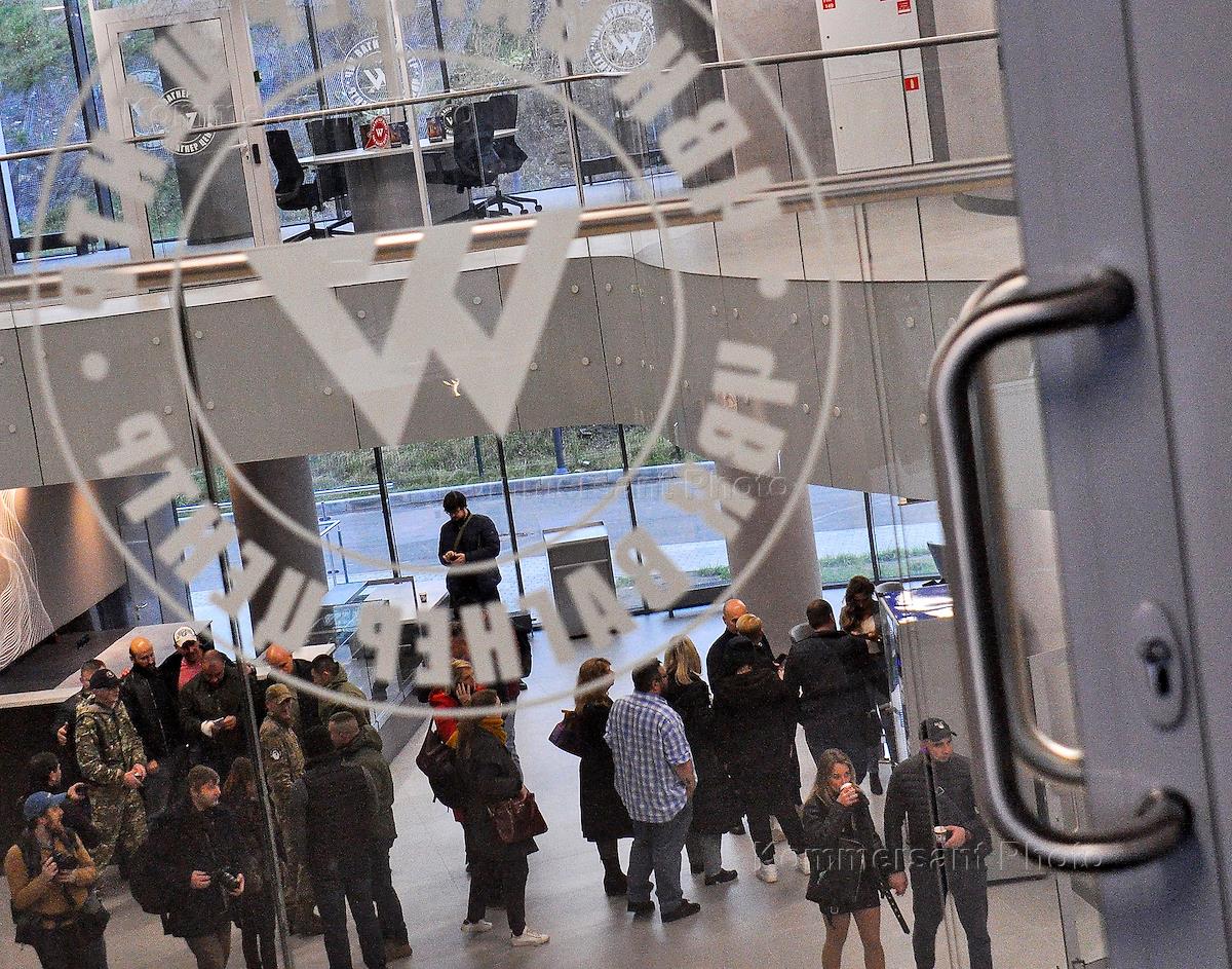Церемония открытия бизнес-пространства "ЧВК Вагнер центр" в Санкт-Петербурге. Жанровая фотография. Посетители в фойе бизнес-пространства.