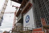 Возведение первого и второго энергоблоков Курской АЭС-2. Жанровая фотография. Баннер "Росатом" на строительной площадке.