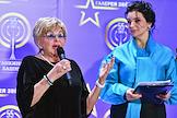 Церемония открытия историко-познавательного комплекса "Галерея звезд отечественного телерадиовещания", посвященная 55-летию Останкинской телебашни, прошла в Останкинской телебашне. Телеведущие Екатерина Стриженова (справа) и Ангелина Вовк (слева) во время церемонии.