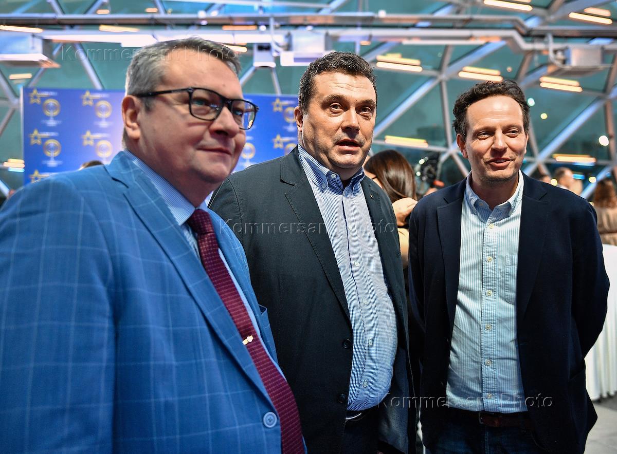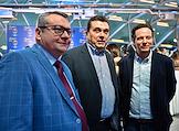 Церемония открытия историко-познавательного комплекса "Галерея звезд отечественного телерадиовещания", посвященная 55-летию Останкинской телебашни, прошла в Останкинской телебашне. Справа налево: генеральный директор Национальной ассоциации телерадиовещателей Александр Широких, председатель Союза журналистов России Владимир Соловьев и заместитель генерального директора ФГУП "Российская телевизионная и радиовещательная сеть" (РТРС), директор филиала РТРС "Московский региональный центр" Дмитрий Назаров на церемонии.