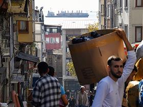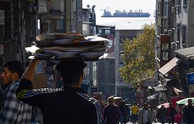 Виды Стамбула. Жанровая фотография. Мужчина несет поднос с тарелками на голове.