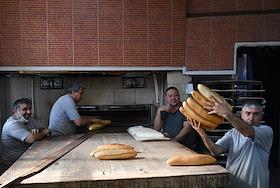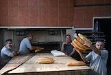 Жанровая фотография. Пекарня в городе. Мужчины во время выгрузки хлеба из печи.