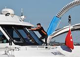 Жанровая фотография. Мужчина моет лобовое стекло на яхте.