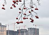 Виды Санкт-Петербурга. Жанровая фотография. Гроздья рябины на фоне кранов на строительстве многоэтажного жилого комплекса.