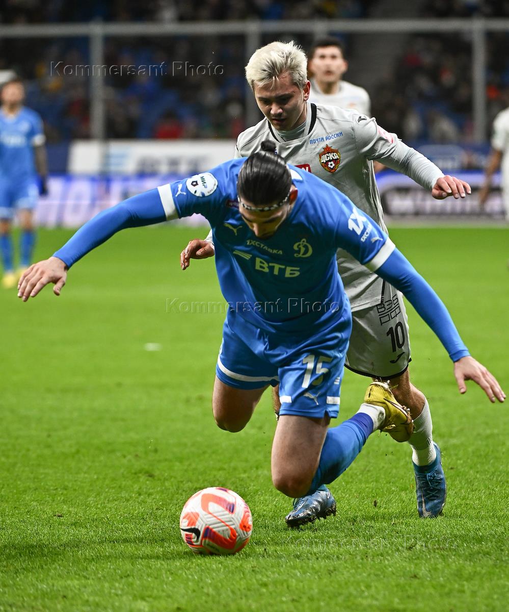 Russian Premier League (RPL). MIR - Russian Football Championship 2022/2023. 17th round. Match between the teams "Dynamo" (Moscow) - CSKA (Moscow) at the stadium "VTB Arena". Dynamo team player Saba Sazonov (right) during the match.