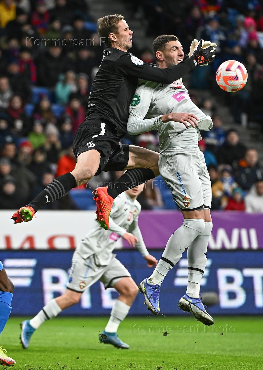 Российская Премьер-Лига (РПЛ). МИР - Чемпионат России по футболу 2022/2023. 17-й тур. Матч между командами "Динамо" (Москва) - ЦСКА (Москва) на стадионе "ВТБ Арена". Вратарь команды "Динамо" Антон Шунин (слева) и игрок команды ЦСКА Виллиан Роша (справа) во время матча.