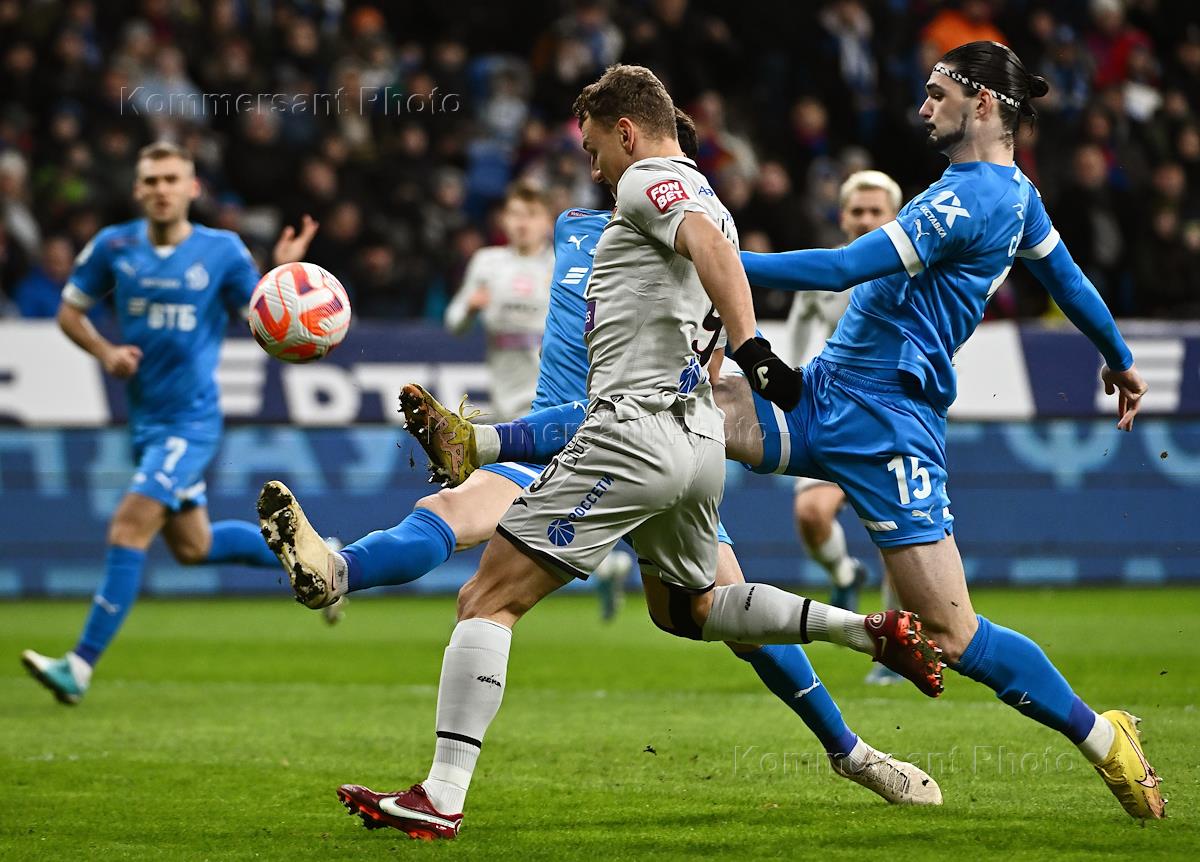Российская Премьер-Лига (РПЛ). МИР - Чемпионат России по футболу 2022/2023. 17-й тур. Матч между командами "Динамо" (Москва) - ЦСКА (Москва) на стадионе "ВТБ Арена". Игрок команды "Динамо" Саба Сазонов (справа) во время матча.