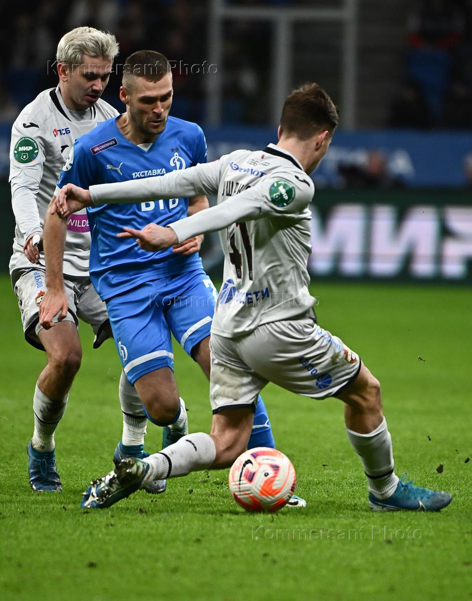 Российская Премьер-Лига (РПЛ). МИР - Чемпионат России по футболу 2022/2023. 17-й тур. Матч между командами "Динамо" (Москва) - ЦСКА (Москва) на стадионе "ВТБ Арена". Игрок команды "Динамо" Саба Сазонов (справа) во время матча.