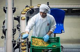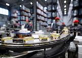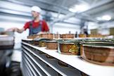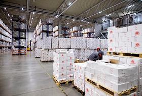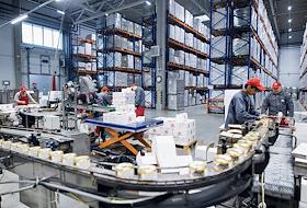 The work of the fish processing complex "For the Motherland". Genre photography. Packaging in the warehouse of finished products.