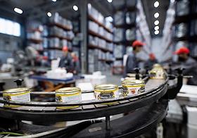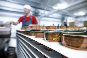 The work of the fish processing complex "For the Motherland". Genre photography. Canned mackerel on the conveyor.