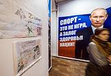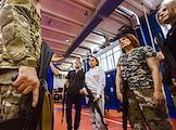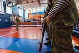 Урок довоенной подготовки в Спортивно-патриотическом клубе "Ярополк". Жанровая фотография. Плакат с изображением президента России Владимира Путина и надписью "Спорт - не игра, а залог здоровья нации" на стене в клубе.